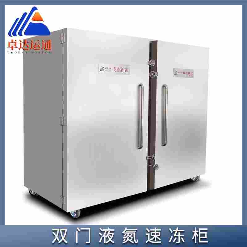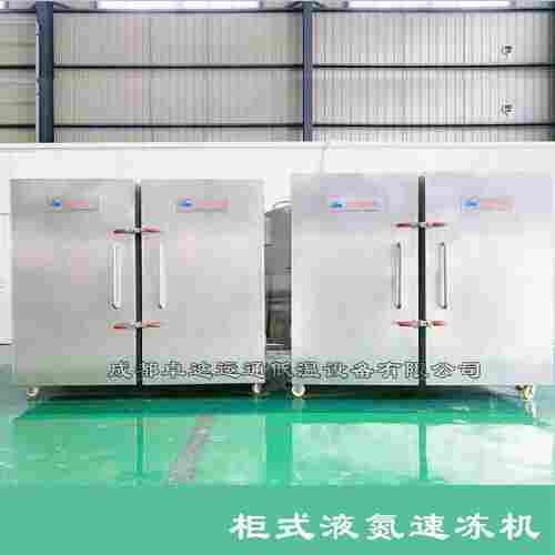 柜式液氮速冻机利用液氮作为冷媒直接冻结食品, 液氮冻结的原理是将低温液氮直接喷淋在食品上,利用其常压下汽化的低温度( -196℃)和在物料表面直接汽化的高换热系数,使食品迅速深度冻结。目前在国外液氮冻结法已广泛应用于海产品、整鱼、肉饼、分割肉、果蔬、汉堡等调理食品以及冰淇淋硬化等领域。 柜式液氮速冻机,内置多个不锈钢物料盘,通过喷嘴向物料表面直接喷淋液滴,物料在不锈钢盘上与低温氮气通过风机搅动进行热交换,进行快速冻结 。汽化的低温氮气由排气口排出,速冻1kg食品,液氮消耗量约为0.3—1kg之间。由于冻结时间短,而且主要靠液氮直接汽化换热,因此冻品干耗较用风冷方法小很多。 一、主要技术指标: 冷媒:液氮; 工作温度范围:室温-196℃; 喷淋降温方式:多点雾化喷淋; 降温速率:≤30℃/min; 控温方式:智能化控制 ; 配电规格:AC380V/50Hz; 整机功耗: ≤3KW; 二、功能及特点: 物料支架:移动式可调304不锈钢物料架循环系统; 制冷系统:液氮汽化蒸发式制冷系统,双电磁阀温降,变频调速双风机循环制冷; 设备保温:保温层为气凝胶绝热毯加聚氨脂泡沫保温,厚度160mm,保温性能优异安全; 设备系统:采用德国进口液氮循环雾化喷淋系统; 风冷循环:大功率风机配加强型轴流风扇,风速可调,冷速快速均匀; 设备控制:触摸屏+PLC自动程序操控系统,输入简单易学,控制直观可靠,带温度监控及报警功能,电气互锁,确保设备及工艺运行安全; 设备维护: 机体底部带排水出口,易清洗,易维护 ,长寿命低耗材设计; 三、产品优势: 1、较低温度约-196℃。速冻时间短,单位时间产量大,效率高; 2、保鲜时间长,食品质量好,能很好的保持食品原有口感; 3、干耗少,不流失营养汁液和水分,解冻后的食品能保持“原汁原味”; 4、相同产量的能耗低,冷量损失小,运行成本低; 5、易清洗易维护;一键式操作告别繁琐设置苦恼; 6、投资少,比传统的冷库速冻节约30%以上; 7、采用液氮制冷安全卫生、无污染,并能抑制微生物增长和繁殖; 8、利用液氮速冻的食材可以直接拿到QS; 9、液氮是惰性气体速冻后的食材耐氧化保质期是传统速冻设备3倍以上; 注:该产品为定制型设备,本平台所述产品参数及其他描述仅供参考,具体参数及价格需根据客户需求而定,如需了解具体参数及价格请咨询我司销售人员。
